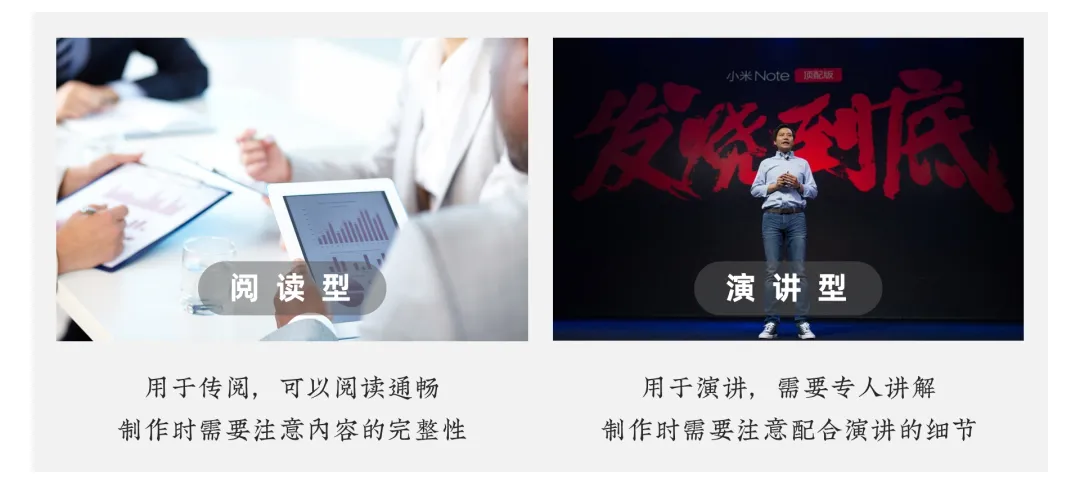 所以,我们并不能单纯用「字多」还是「字少」去粗暴地判定一份幻灯片的好坏。因为不论用哪种类型,好的幻灯片设计往往能够为演讲人提供有效助力,辅助他们更好地进行内容的陈述,所以实际制作中,也要综合衡量并因人而异的去制作幻灯片。并非身边的每个人都是演讲大师,实际演示中,如果演示者是一个并不擅长临场演讲的人,场合又不具备「提词板」的规格,那么将演讲型的幻灯片做成偏向阅读型幻灯片,也无可厚非。我们提倡制作幻灯片时要使用更加精炼的文字语言,但如果他们并不能被改变,我们应该竭尽所能的用幻灯片去帮助他们,而不是逼迫他们。