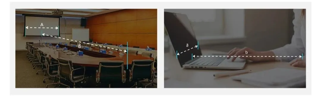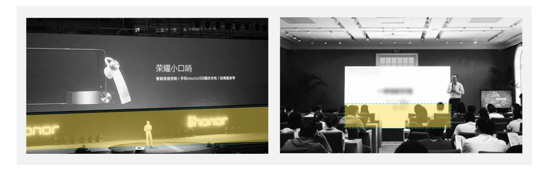 播放设备的型号、分辨率、场地屏幕尺寸、屏幕端到最后一排座椅的距离等,这些看似微乎其微的细节,在现场都可能成为影响演示中的「大问题」。演示型PPT要保证所有观众都能看清楚PPT上的字,所以投影幕布到观众最后一排的距离将决定着字号的大小。解决这个问题最好的方案,是在演示前能够去场地确定一下,比如去会议室现场提前测试一下,这个方式最为靠谱。但也不得不说,我们平时在做定制服务的时候也会发现,很多发布会幻灯片的设计一般都得提前一个月开始制作,而这种大型发布会需要专门去一些演播厅、体育馆等场地,经常在发布会前一两天的时候才能搭建舞台和屏幕,没有提前测试的条件。所以也就曾经发生过,前期做好的PPT,客户也非常满意,但提前一天做彩排的时候发现字号有问题,而对于这种发布会的幻灯片设计,哪怕调几个字号都可能动一发而牵全身,对排版的影响很大,设计师连夜加班改,会很仓促。这个目前也没有非常科学严谨的办法,如果一定要有个估测,后来我倒是有个粗略估算的小经验。假设现场屏幕放映画面宽度为A、场地最后一排到屏幕的距离为B(会场一般都有尺寸图纸,信息很好问到)。PPT在电脑上放映状态下,屏幕放映画面宽度为a,你与屏幕的距离为b。