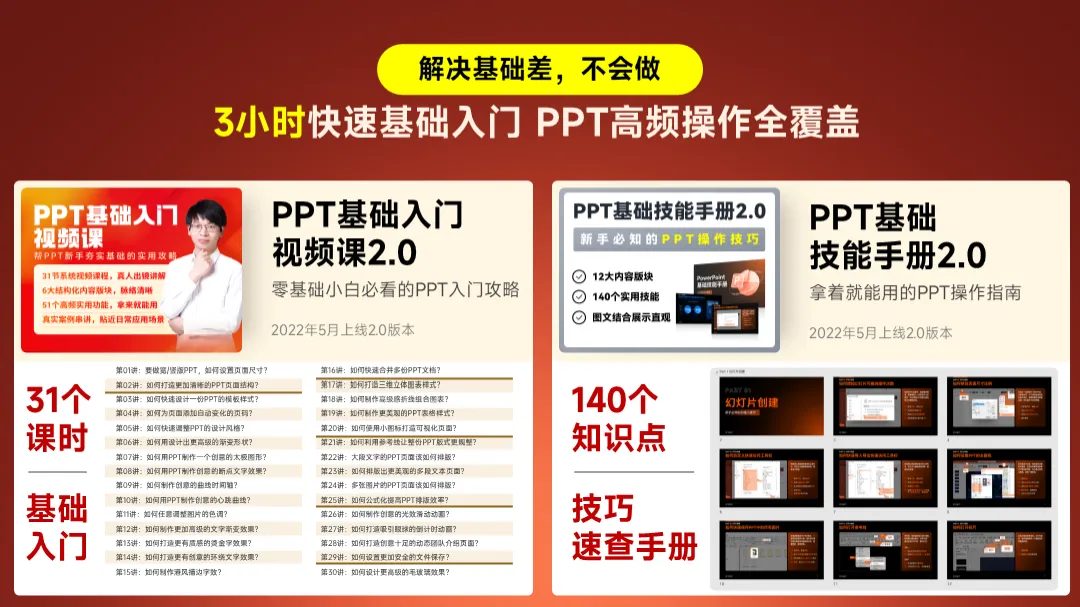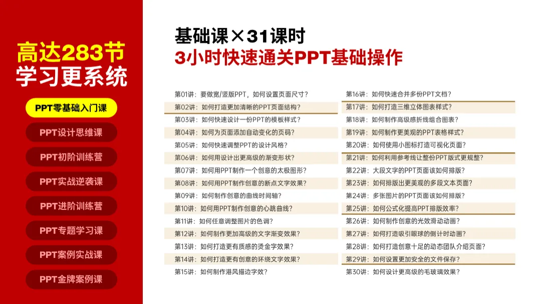 如果你做 PPT 效率贼低,套模板都要花几个小时,甚至连软件功能还没有搞明白。这门基础课一定要看,有31节课,覆盖PPT所有高频操作知识点:3个小时,也就是你看一部电影的时间,PPT基础就通关了,比自己一个人摸索,效率高太多了。而且,学完就能用。因为每一节课,我都会结合具体案例,教会你这个功能是什么,以及应用场景:我们已经帮你把PPT基础知识点,做好了分类整理,可以快速查找,就像查字典一样,很方便: