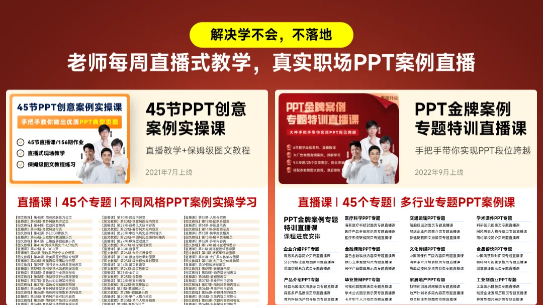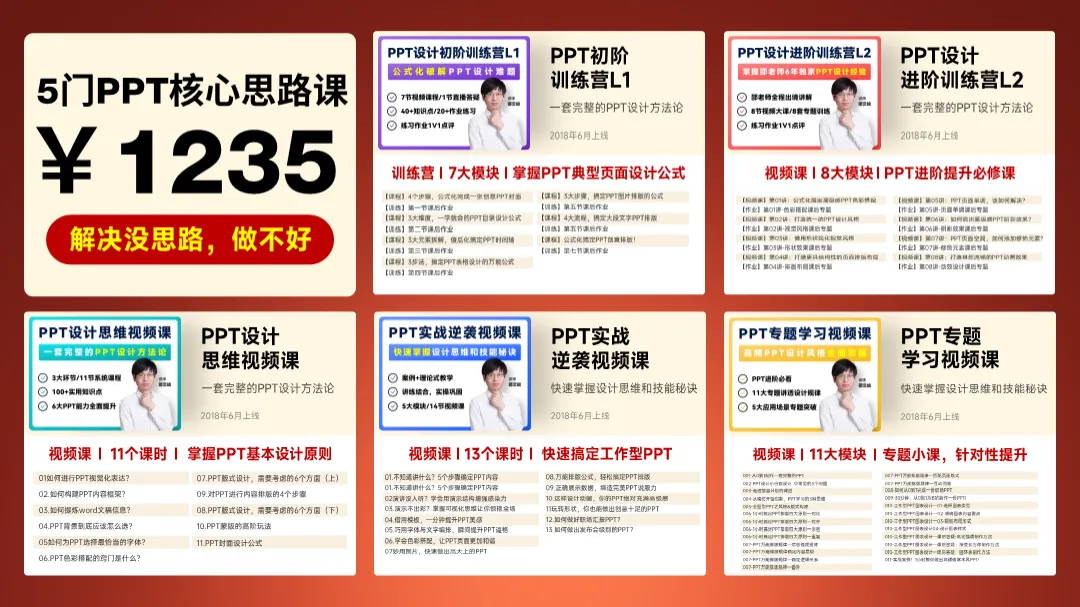 这5门PPT设计思维课程,是我做PPT 7年来,总结的最有效的经验,单独售价1235块钱:从PPT内容撰写,结构搭建,到风格设计,排版布局,设计细节,动画演示,你全部都可以学到,可以说超级全面了:当你学完这些核心思路,职场PPT已经能轻松应对了。如果还想利用业余时间,做PPT副业挣钱,我们今年还有一门副业变现课要上线。大家在市面上见到的很多副业变现课,最便宜的也要3000块钱以上,今天报名的同学,等这门课程上线,免费学,够不够划算?你有没有过这样的经历?看教程的时候,觉得自己学会了,但一上手,发现还是不知道怎么做?这两门案例课,高达90节,老师手把手教你,怎么把学到的方法,实际运用到PPT里: