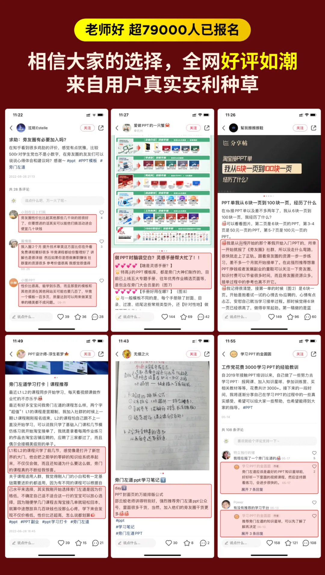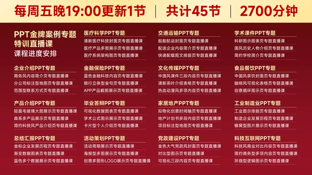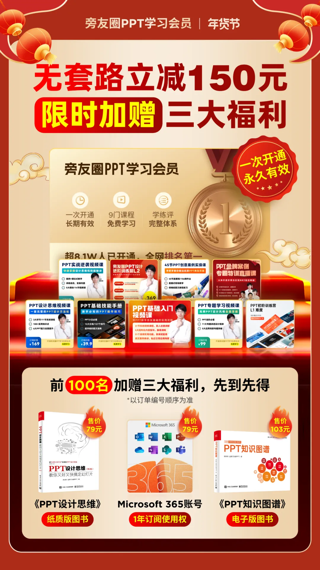 此外,网上很多的案例课,都是录播,遇到了问题,也没办法跟老师互动。而我们给大家安排的,都是直播课,遇到问题,可以直接向老师提问,现场解决疑问,学习效果更好:当然,名师才能出高徒,课程都是我来讲的,不谦虚地说,我自己也算是PPT领域的TOP级老师。我写过书,有30W册的畅销量,还写过1100多篇教程,吸引了近200万读者关注:另外,全国只有我们一家,获得过B站官方颁发的百万粉丝金牌,足以证明教学实力:如果课程不够好,性价比不够高的话,学员是不会在网上,自发安利推荐给其他人:另外,学习过程中,遇到问题,我们还为你提供助教1V1答疑服务,解决一切学习过程中的障碍:开通旁友圈会员,以上服务全部免费,怎么样?够划算吗?做 PPT 最怕的就是没灵感,这13000页模板,让你拥有一个属于自己的PPT设计灵感库,再也不怕改稿:每到年底,我们都会从近9000页的优秀作业中,二次筛选,找出最好的1980页PPT作品。而且,我们按照多种维度,对页面进行了整理分类,让你1分钟,找到合适的PPT灵感参考。或者是基于页面类型维度,你可以快速查找PPT封面设计灵感:不过,当你下载时,可能唯一会让你不爽的,就是资源太大了,甚至需要下载一整晚:另外,在去年,我们从这4年的灵感手册中,再度筛选,可以说优中选优,又整理出一份:而且,搭配旁友圈定制版免费 Billfish 软件,你还可以直接实现标签式查找,极度高效:平时我们给客户做一页PPT的价格,大概是1500左右,因为我们服务的是国内顶尖的品牌:所以,职业PPT设计师做出来的 PPT 模板,页面质量不用怀疑。而且,因为是专业设计师出品,所以,完全遵循设计规范。你不仅可以一键给所有的模板页面更换颜色:且为了保证的实用性,这些手册的所有页面,都是基于真实职场 PPT 修改。对于工作中常见的 PPT 页面而言,60 秒搞定一页 PPT,真不是夸张:剩下的,就只需改字,傻瓜式套用,即可做出多个不同版式的页面:每一份模板都是150页,单独售价99元,已经销售了近7000份。而开通会员,这6份模板,全部免费赠送,无需额外付费:而且,11月,我们刚刚上线了一份全新的中国风模板,会员依旧免费下载:为了能够让旁友圈学员们,一键就能做出高级流畅的PPT动画效果,我们把为国内顶尖品牌做 PPT 设计时,用到的动画,积累在了一份150页的动画手册中:有了这份手册,你只需要使用动画刷功能,一键即可傻瓜式做出发布会级别的流畅动画。当然,除此之外,还有很多的会员权益,鉴于篇幅问题,没办法全部展示。年货节期间
