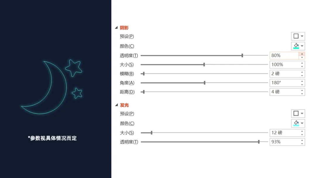 如果我们想要为它添加霓虹灯效果,只需要添加上发光和阴影效果就够了: