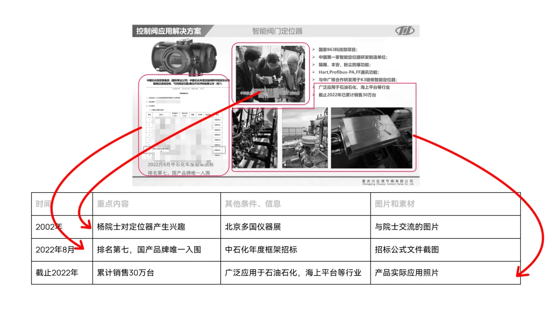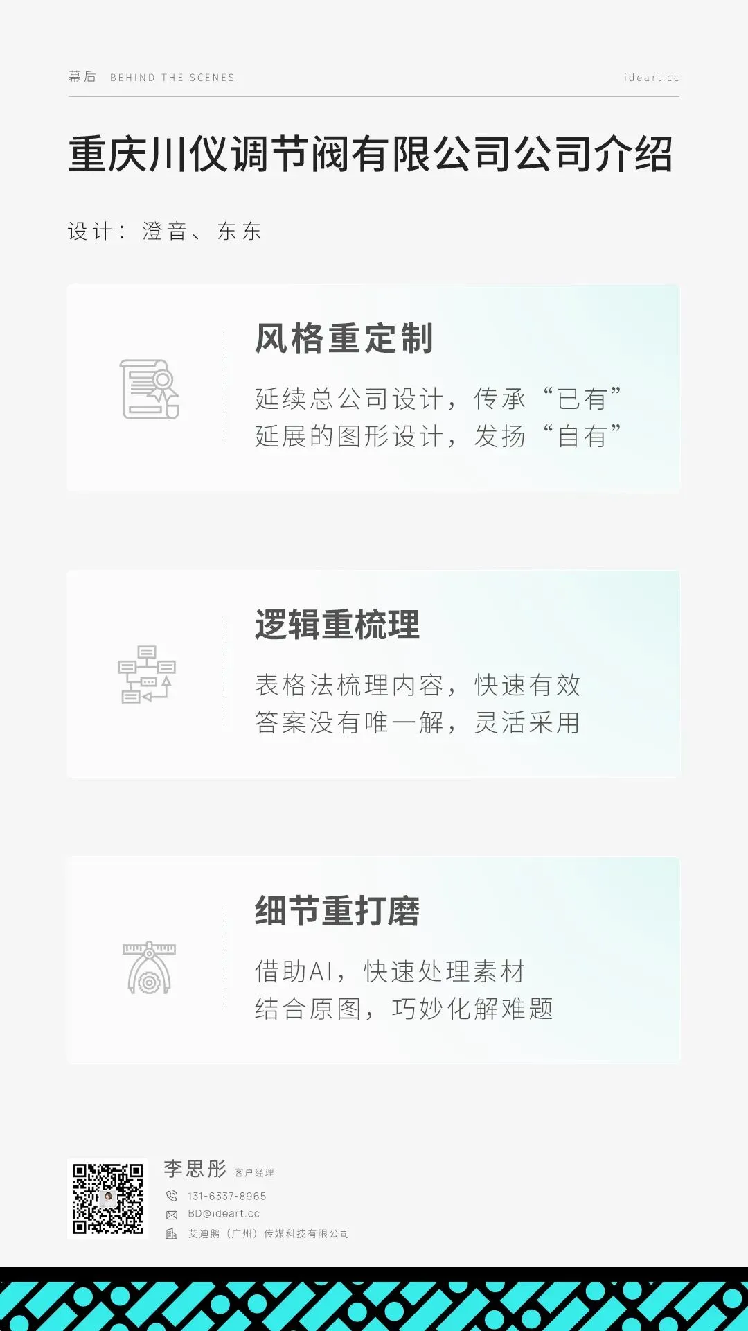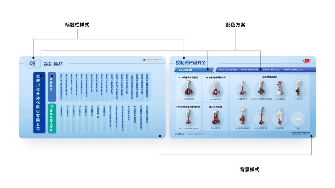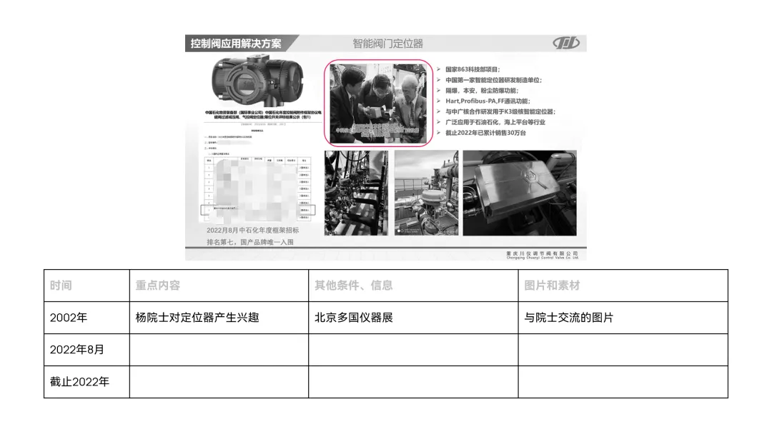 好久不见,这期的《幕后》,我们回到一个企业介绍PPT项目。企业介绍,一直是演示定制中的一个大品类。这类项目不同于短平快的比赛型、演讲型PPT,完整的流程往往比较漫长,甚至设计开始前就有着不少的其他工作。企业介绍类的PPT,制作的是一家企业的对外名片,客户往往非常注重稿件是否为针对性的「定制」,而非套路化、模板化的处理。本期,我们就从一个相对简单的企业介绍项目入手,聊聊体现「定制化」的3个基本要求。这个项目的客户是一家阀门产品相关的公司,一方面想展现自身的一流、专业,另一方面也要有身为国企“正规军”的正式感。有时候其实没那么复杂,问问客户有没有他们自己的“总公司”“母公司”等的一些设计对标。一开始我们并没有询问客户是否有总公司的设计需要对标。于是根据客户本身所在专业领域的感觉做出了设计。实际上,最后的定稿设计,风格说不上有点相似,起码也是毫无关系。所以第一眼看过去,会有一些无法理解的地方。比如为何背景会有比较明显的色彩,标题栏为何有那个双圆圈的图形。问题来了。啥都照着“总公司”的来,那还要咱们设计什么。其实我们可以把这次项目的设计划分成两个部分。一部分“传承已有的”,另一部分“发扬自己的”。整个logo图形可以看做用平行四边形配合圆弧线构成了【川】【仪】两个字。那么我们就可以从中提取出本次设计会用到的核心图形:圆角平行四边形为了增加设计细节,我们可以模仿logo的图形组合方式,为圆角平行四边形添加细节:得到的这个图形组合,就是个非常不错的小标题容器,应用在页面的各个位置。需要注意,这样的图形因为存在倾斜,无法存放多排文字,在使用的量上需要一定克制。只要能够让人注意到有这么一个图形,并和logo的形态联系起来,我们的设计目的也就达到了。确定了风格,我们可以开始正文内容的设计。这次不聊太多,我们就看一个实战中经常遇到的也让很多小伙伴头疼的页面类型——超多内容页。原稿的这一页几乎被图片和文字铺得满满当当。面对这种页,很多小伙伴也会望而止步。对着内容看半天也想不出什么点子。➊ 首先,从页面中寻找最容易找到的内容。比如:时间、地点、金额、称号……例如这次我们去找最容易找到的时间,讲这些词填入表格第一列。➋ 接着,我们对应第一行的时间,填入属于这个时间的内容原稿中还有一部分内容没有填入表格,在梳理时可以单独进行一次处理:以上面梳理完成页面作为“半成品”,就可以着手页面设计。比如可以先把“时间轴”表格部分完成:页面本身倒也没有用太多高难度设计手法,像这样内容比较满的页面,按照整理好的逻辑,基本都能比较好满足客户需求。这一页也是项目后续多次修改反馈中没有改过的页面。当然,表格法梳理内容,答案并不唯一。这只是第一列填写时间关键词得到的最终结果。不同的人会有不同的填法。比如有点小伙伴可能会在第一列填入“人物、单位”,并以此扩充表格:这个表格相较于前一个内容梳理表格,空的格子更多,如果这个梳理逻辑被客户认可,那么可以辅助我们向客户询问是否有内容补充,以完善页面内容:当然,这个梳理方案没有用上,因为当我们把第一个表格的内容设计完成后,客户就直接让这一页过稿了。而如果以第二个表格梳理出的内容进行页面设计,可能又是另一种页面了。最后是我们经常谈到的设计细节。这些很难被看到,但是有和没有对最后的成品又存在比较大的影响。若是不太想重新想一个排版,可以直接把图宽度补起来。如今,AI工具也是十分好用。加上图片在页面也比较小,简单用AI扩个图,不需要太精细,就可以满足设计要求:也有一些AI处理不了的。比如这张图,原图的图、文混杂一起,不好处理。但是最后一张图有点犯难了,因为图片的顶部没有明显的边缘线,不太好处理难道直接顶上一刀切?前面三张图片都有穿插式的设计,第四张这里总感觉少了点什么。其实可以动动脑筋,顶上的部分,我们画一个“横截面”不就行了