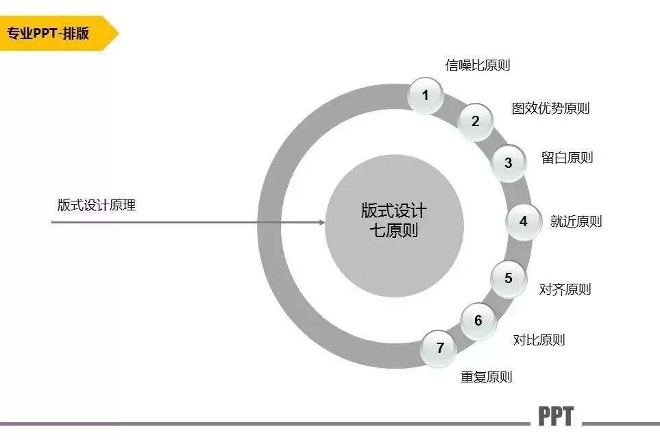 PPT排版一定要记住遵循7个原则,分别是信噪比,图效优势,留白,就近,对齐,对比,重复原则。其中前三个原则是思维层面的设计,后四个是表现层面的设计。