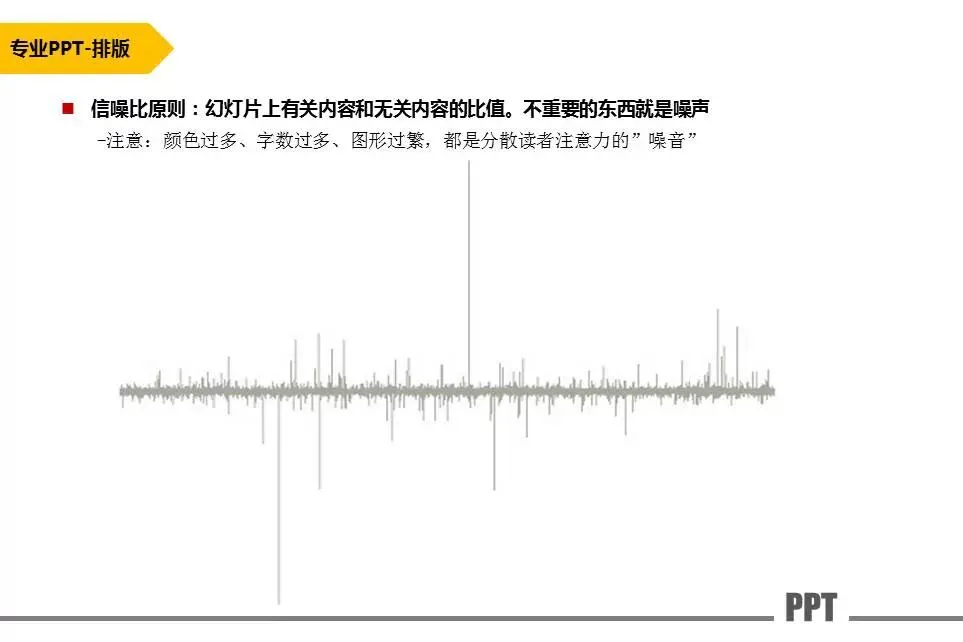 幻灯片上有关内容和无关内容的比值。不重要的东西就是噪声。注意:颜色过多、字数过多、图形过繁,都是分散读者注意力的”噪音”。