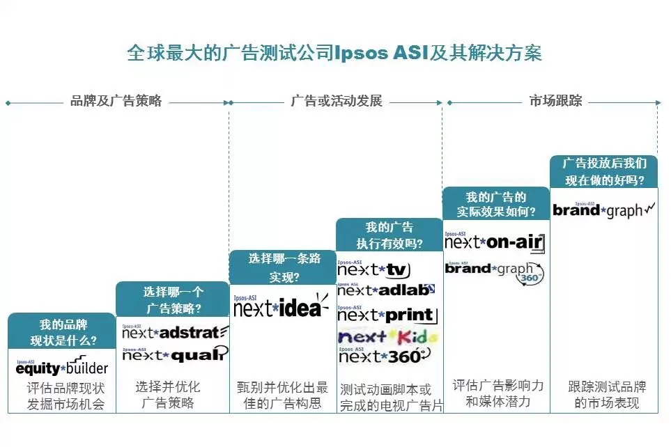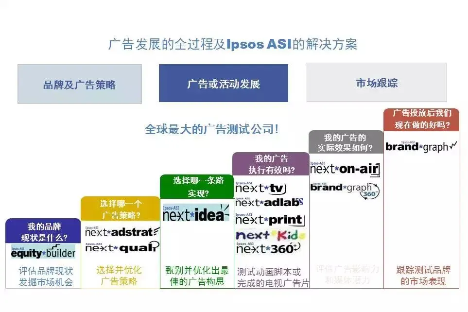 我的处理是,首先减色,整张片子保留蓝色一种主色调,其他颜色统统擦去。为什么保留的是蓝色,因为益普索公司的VI视觉形象体系是蓝色,为什么不是原来的纯蓝色,因为太老土保守,跟不上时代审美潮流,所以我稍作改变成天蓝色。再然后,减少图形模块,用线条表示,为了表示广告发展的全过程内在逻辑,我用箭头配合虚线进行了说明。