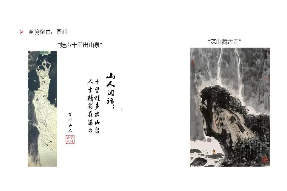 请看意境留白在传统国画中的应用。“蛙声十里出山泉”是中国著名画家齐白石老先生在1951年为文学家老舍画的一张水墨画。画面上没有蛙,却只有几只活泼的小蝌蚪在湍急的水流中欢快地游动着,而这蛙声也非是即时可“听”见的,运用了这种特殊的联想手法,恰到好处,是意境留白的一种构思。