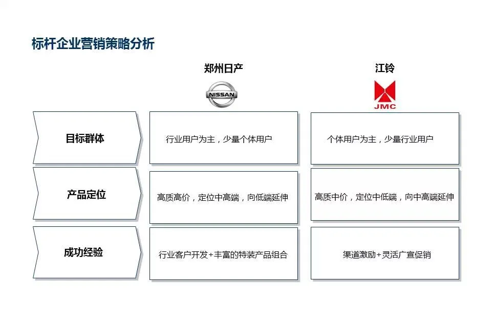 这张片子,完全符合就近,对其,对比,重复原则啊,但是却不能称为好的片子。分析下,这张片子最重要的主题是对比,即郑州日产和江铃两家企业皮卡的营销策略差异,该片子对比原则有所体现但不够突出;其次,对比的内容层次不清,到底在哪些方面来进行对比,单从片子的表现形式来看是没有体现的,需要读者自己去总结猜测,这就不好了。基于这两方面的问题,我的调整如下: