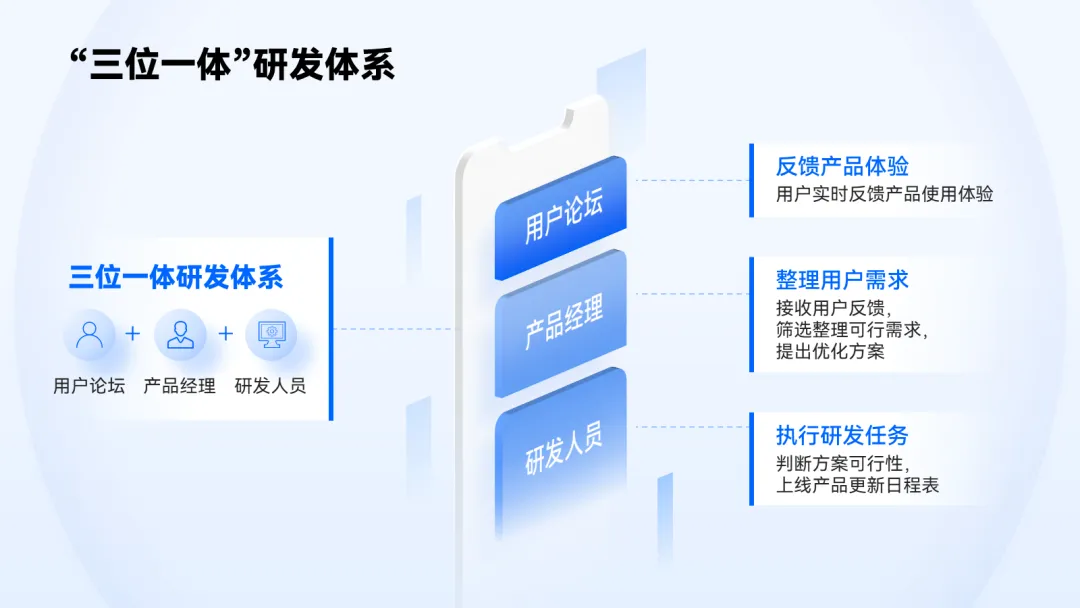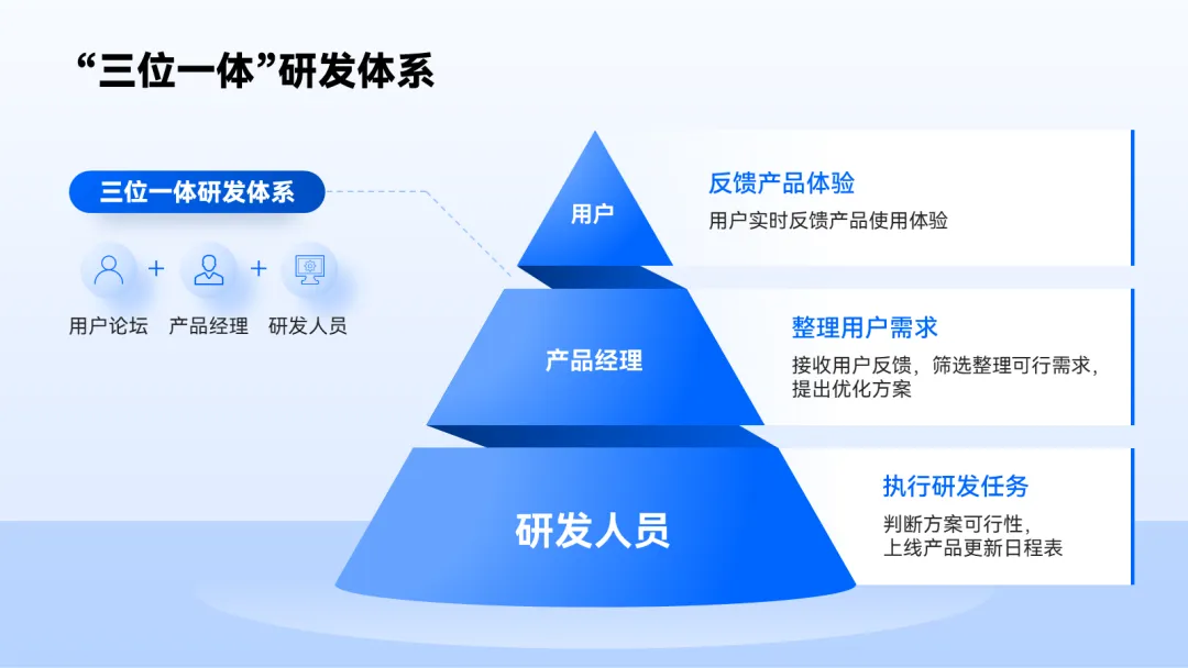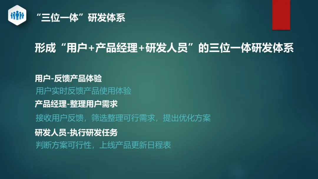 ”,就是指由“用户+产品经理+研发人员”所构成的完整研发体系。