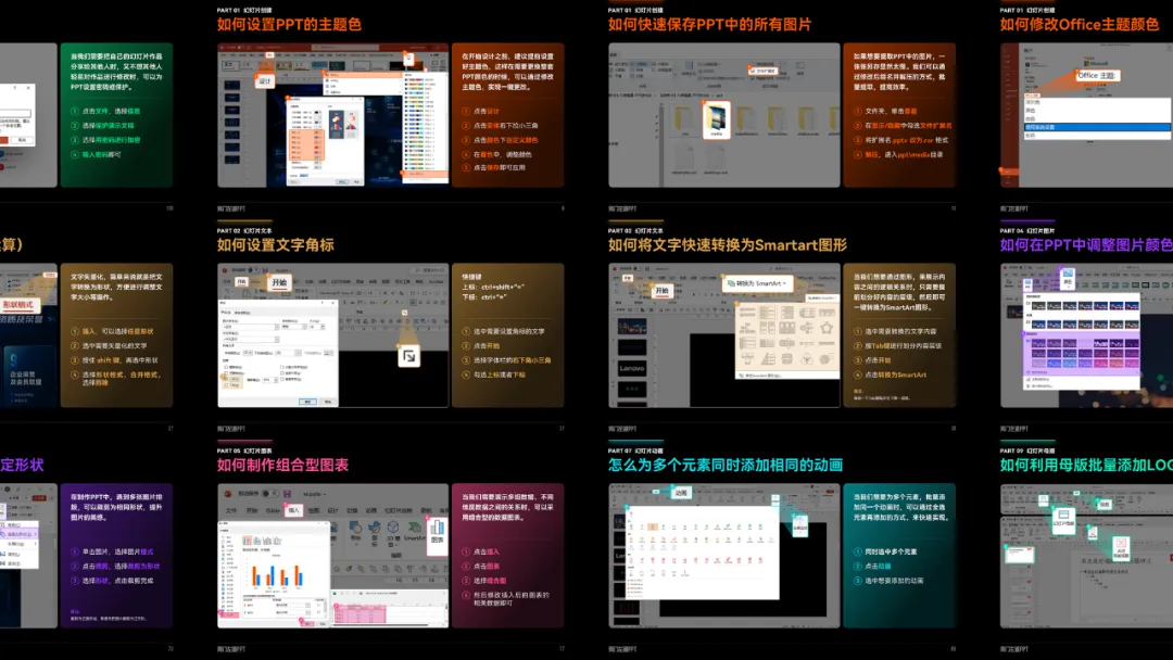 如果你做 PPT 效率贼低,套模板都要花几个小时,甚至连软件功能还没有搞明白。这门基础课一定要看,有31节课,覆盖PPT所有高频操作知识点:3个小时,也就是你看一部电影的时间,PPT基础就通关了,比自己一个人摸索,效率高太多了。而且,学完就能用。因为每一节课,我都会结合具体案例,教会你这个功能是什么,以及应用场景:我们已经帮你把PPT基础知识点,做好了分类整理,可以快速查找,就像查字典一样,很方便: