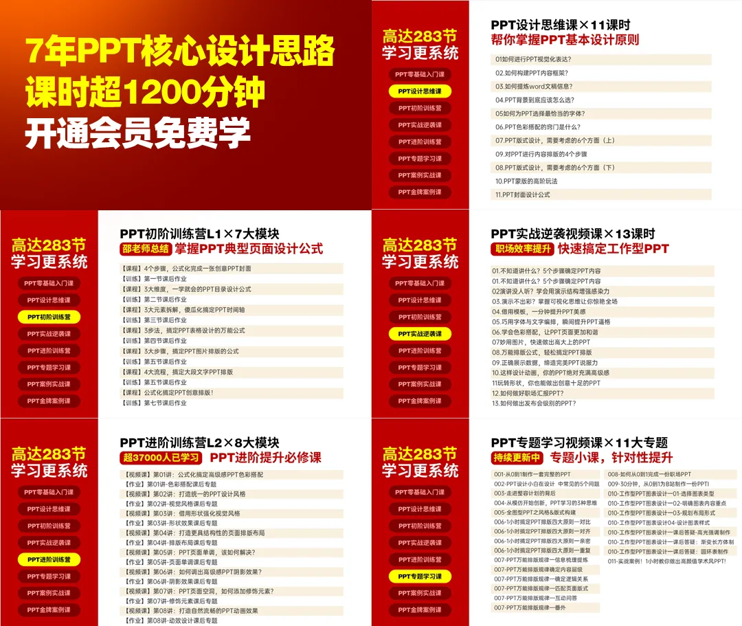这5门PPT设计思维课程,是我做PPT 7年来,总结的最有效的经验,单独售价1235块钱:从PPT内容撰写,结构搭建,到风格设计,排版布局,设计细节,动画演示,你全部都可以学到,可以说超级全面了:当你学完这些核心思路,职场PPT已经能轻松应对了。如果还想利用业余时间,做PPT副业挣钱,我们今年还有一门副业变现课要上线。大家在市面上见到的很多副业变现课,最便宜的也要3000块钱以上,今天报名的同学,等这门课程上线,免费学,够不够划算?你有没有过这样的经历?看教程的时候,觉得自己学会了,但一上手,发现还是不知道怎么做?这两门案例课,高达90节,老师手把手教你,怎么把学到的方法,实际运用到PPT里: