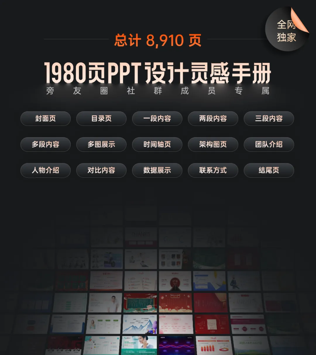 此外,网上很多的案例课,都是录播,遇到了问题,也没办法跟老师互动。而我们给大家安排的,都是直播课,遇到问题,可以直接向老师提问,现场解决疑问,学习效果更好:当然,名师才能出高徒,课程都是我来讲的,不谦虚地说,我自己也算是PPT领域的TOP级老师。我写过书,有30W册的畅销量,还写过1100多篇教程,吸引了近200万读者关注:另外,全国只有我们一家,获得过B站官方颁发的百万粉丝金牌,足以证明教学实力:如果课程不够好,性价比不够高的话,学员是不会在网上,自发安利推荐给其他人:另外,学习过程中,遇到问题,我们还为你提供助教1V1答疑服务,解决一切学习过程中的障碍:开通旁友圈会员,以上服务全部免费,怎么样?够划算吗?做 PPT 最怕的就是没灵感,这13000页模板,让你拥有一个属于自己的PPT设计灵感库,再也不怕改稿:每到年底,我们都会从近9000页的优秀作业中,二次筛选,找出最好的1980页PPT作品。而且,我们按照多种维度,对页面进行了整理分类,让你1分钟,找到合适的PPT灵感参考。或者是基于页面类型维度,你可以快速查找PPT封面设计灵感:不过,当你下载时,可能唯一会让你不爽的,就是资源太大了,甚至需要下载一整晚:另外,在去年,我们从这4年的灵感手册中,再度筛选,可以说优中选优,又整理出一份:而且,搭配旁友圈定制版免费 Billfish 软件,你还可以直接实现标签式查找,极度高效:平时我们给客户做一页PPT的价格,大概是1500左右,因为我们服务的是国内顶尖的品牌:所以,职业PPT设计师做出来的 PPT 模板,页面质量不用怀疑。而且,因为是专业设计师出品,所以,完全遵循设计规范。你不仅可以一键给所有的模板页面更换颜色:且为了保证的实用性,这些手册的所有页面,都是基于真实职场 PPT 修改。对于工作中常见的 PPT 页面而言,60 秒搞定一页 PPT,真不是夸张:剩下的,就只需改字,傻瓜式套用,即可做出多个不同版式的页面:每一份模板都是150页,单独售价99元,已经销售了近7000份。而开通会员,这6份模板,全部免费赠送,无需额外付费:而且,11月,我们刚刚上线了一份全新的中国风模板,会员依旧免费下载:为了能够让旁友圈学员们,一键就能做出高级流畅的PPT动画效果,我们把为国内顶尖品牌做 PPT 设计时,用到的动画,积累在了一份150页的动画手册中:有了这份手册,你只需要使用动画刷功能,一键即可傻瓜式做出发布会级别的流畅动画。当然,除此之外,还有很多的会员权益,鉴于篇幅问题,没办法全部展示。年货节期间