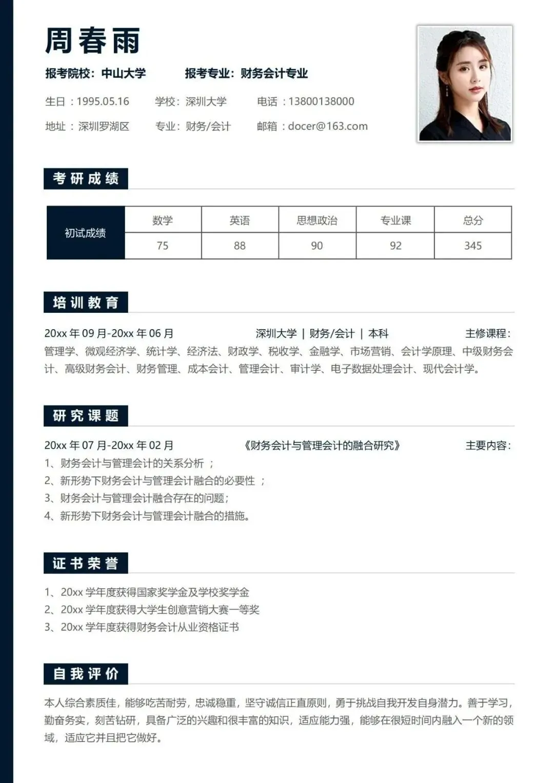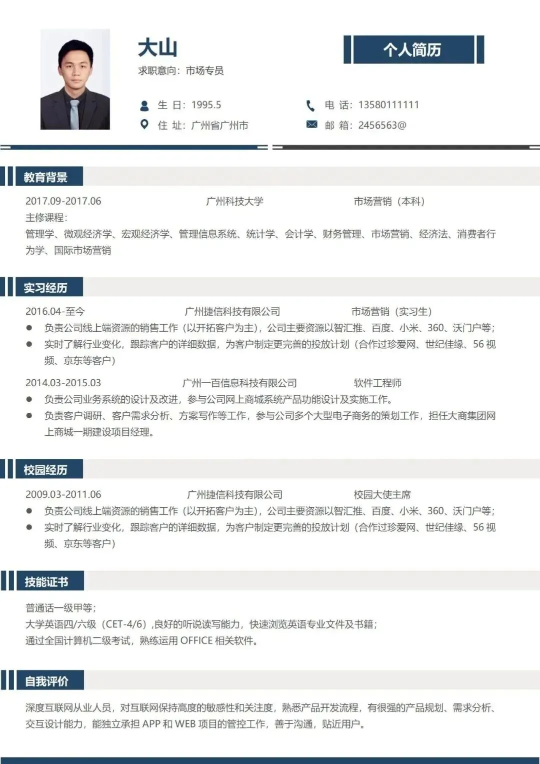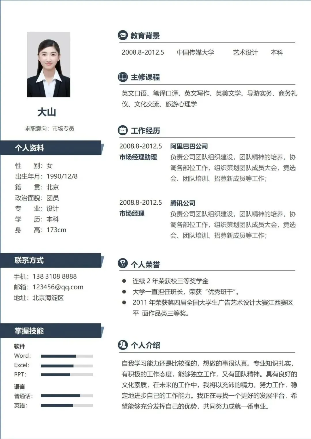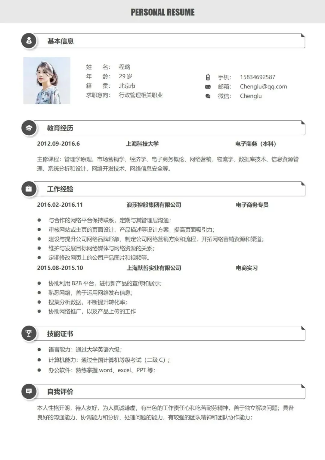 校招在即,还在为求职无门而烦恼吗? 拥有一份专业简历,助你先人一步! 本次分享的个人简历PPT模板,采用职场标准设计,彰显冷静与专业,让你在HR与面试官面前更显可靠,更容易赢得青睐。 图文与图表均可自由编辑,支持一键更换配色,轻松定制自己风格。【涵盖内容】包括基本信息、教育背景、荣誉奖项、工作经历、自我评价、岗位认知等八大板块…… 既适合初入职场的新人,也适用于正计划转换赛道的资深职场人士。温馨提示:两种获取免费方式