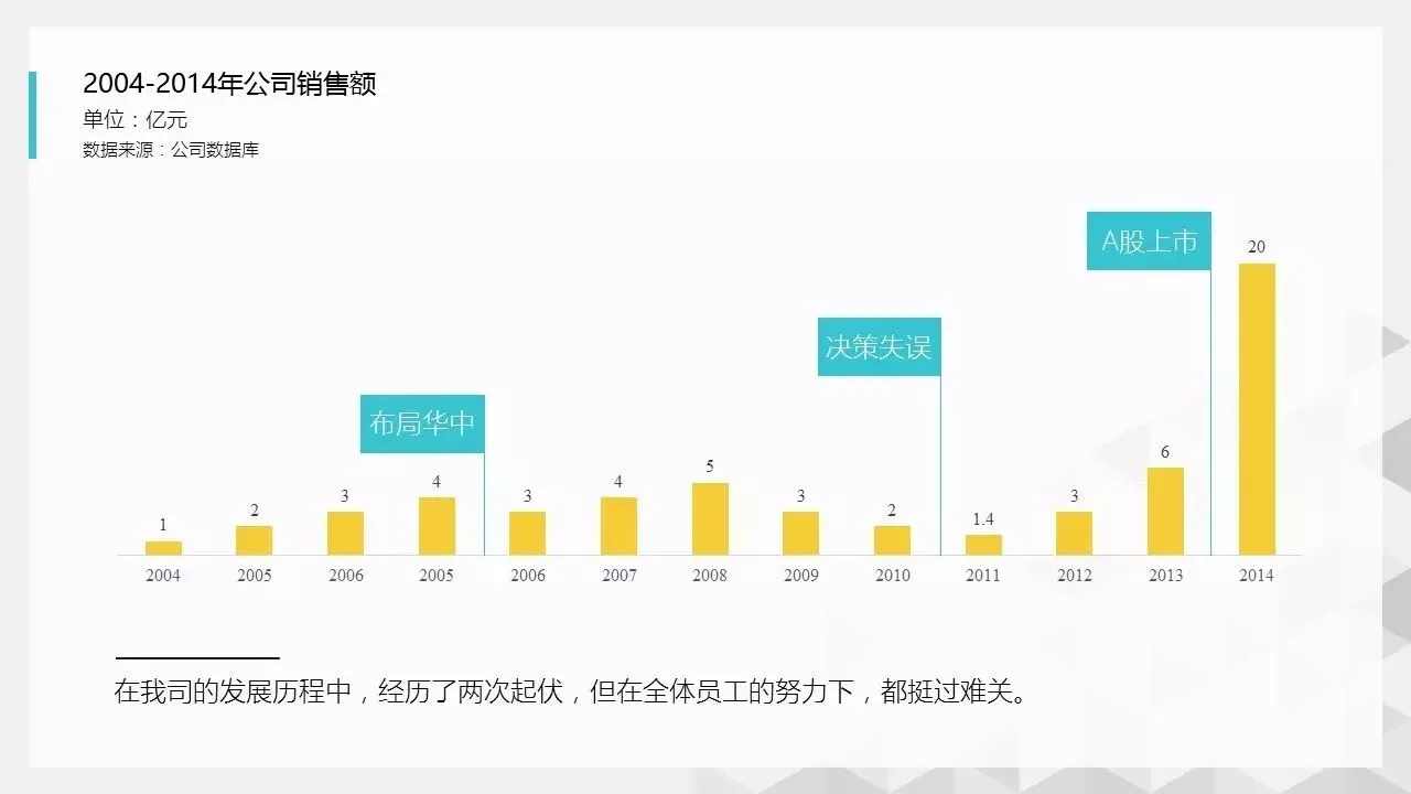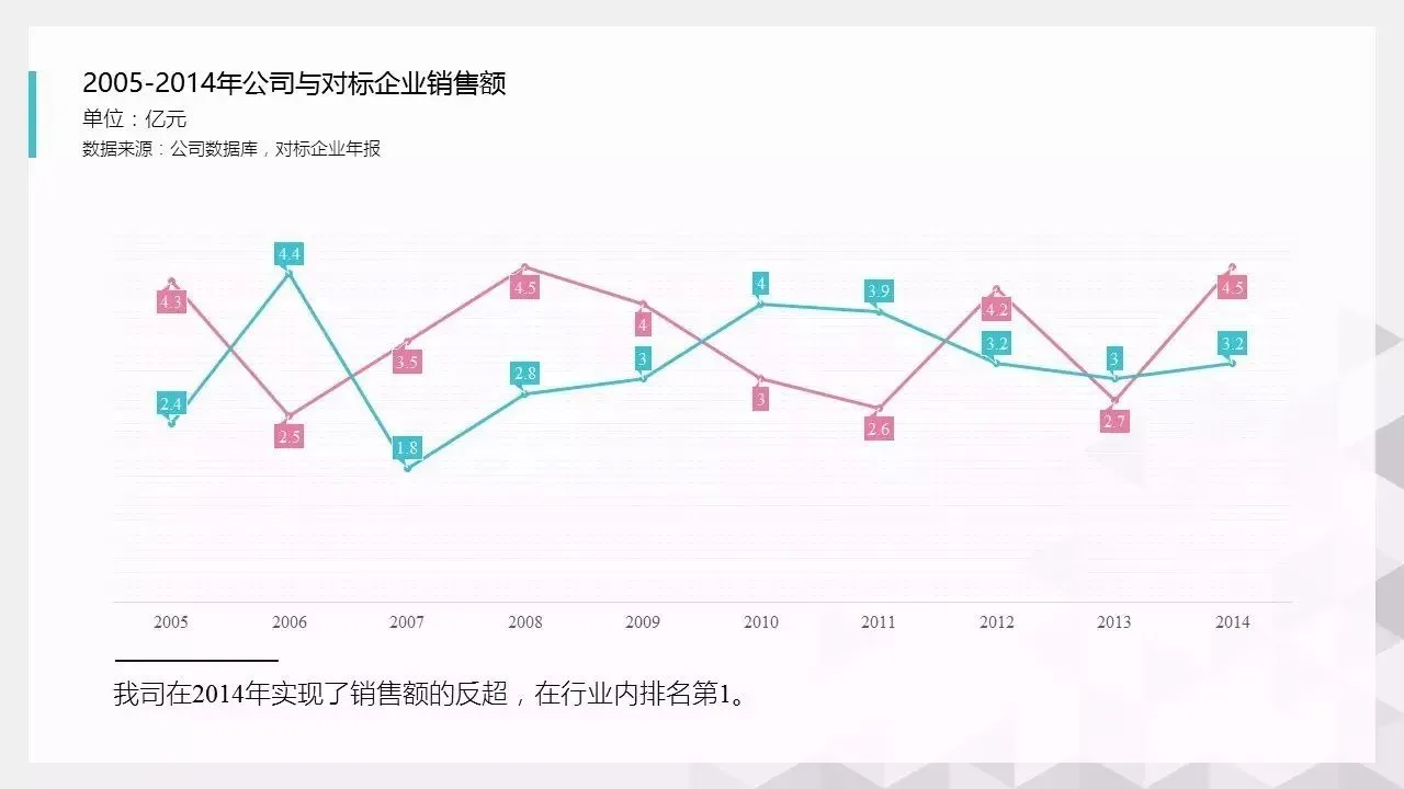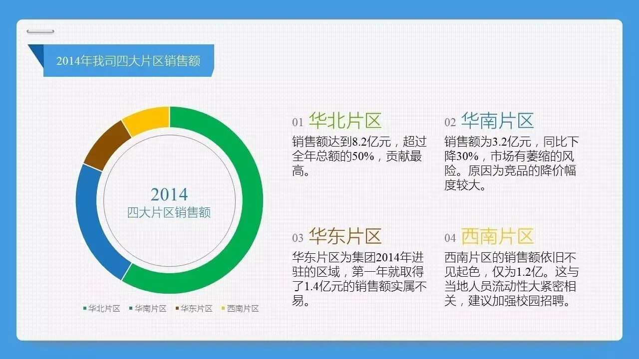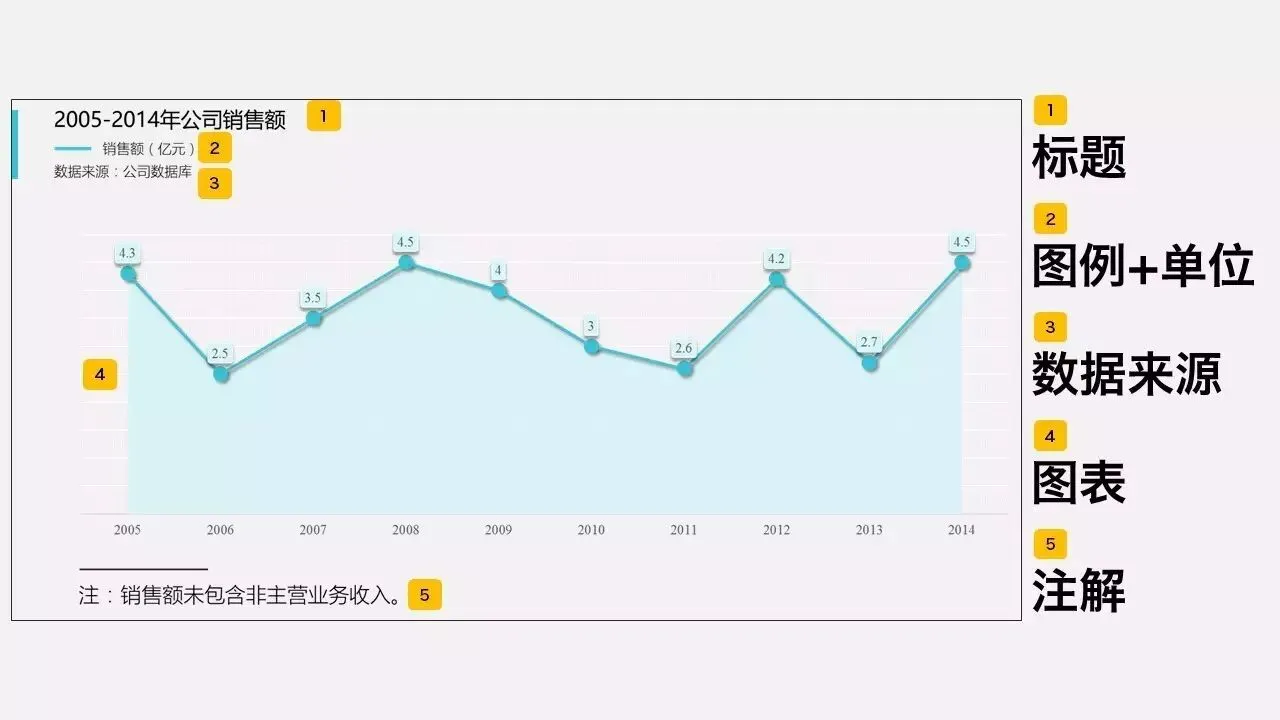 在刚开始制作图表时,我们一般会习惯性地做个饼图、直方图就结束了。但其实这还不够,除了形状本身,完整的图表应该包括以下几个部分:标题的起法一般有两种,第一是描述主题,比如“××公司2015年销售额”;第二是把具体的内容表达出来,比如“××公司2015年销售额实现75%的增长”。也就是图表各部分形状指代的内容,这一般发生在组合图表里,有时还会注明单位,比如柱形代表销售额(亿元),折现代表增长率(%)。如果指标、数据源有需要特别声明的,那需要单独解释,比如“房地产去化周期指目前新建商品住宅的存量除以此前12个月月均成交量”。