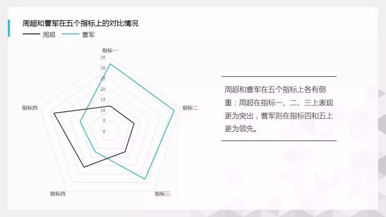 一般使用雷达图,从0点开始,发散开的轴线上放置某项内容的数值。
