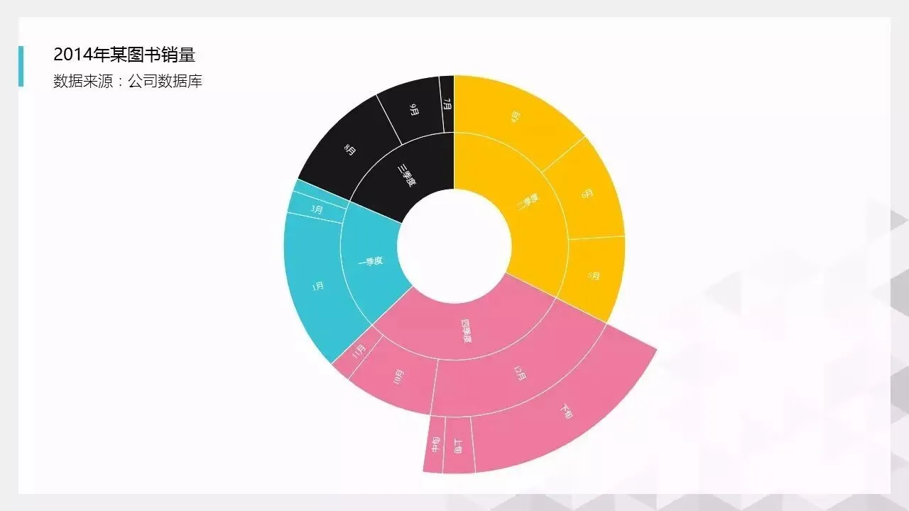 面积图是Excel2016新提供的图表,里面叫做“树状图”,通过面积大小展示数据的情况。如果没有安装Office 2016,可以通过手动绘制得到。8.旭日图