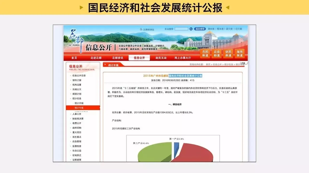如果我们要找城市某个区的人口、经济指标,有些在统计局那还不够完善。可以直接去这个区的政府首页,找到“信息公开”里的“国民经济和社会发展统计公报”,里面基本上有这个区的所有经济发展数据。