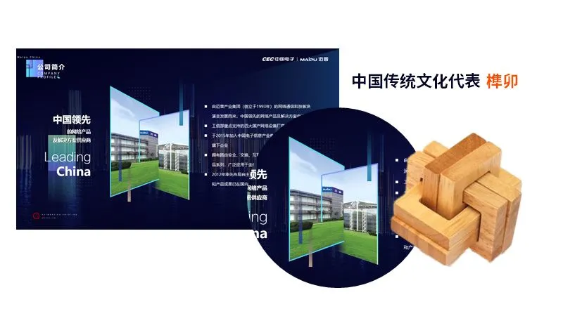 公司简介页,将图转换视角组合成异形,还有左上角标识的方块形。增强设计感的同时很多细节有所寓意。
