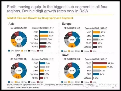 一般PPT的标题都是短语,比如“xxx牌汽车的市场份额”;而咨询PPT的标题栏则是对整页内容的凝练,比如下图中“土方机械在各地区都是最大的细分市场,在世界其他地区呈两位数增长”。
