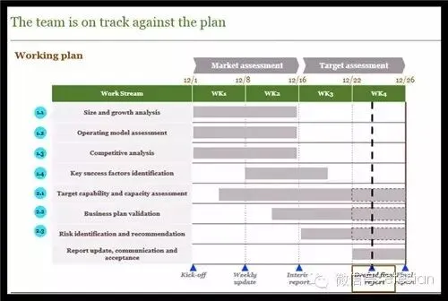 甘特图即时间表,一般用来规划咨询项目的工作进度,多用于竞标的poposal以及项目的kick off。