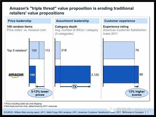 ——tagline里面明确提出了Amazon的 "triple threat" 价值主张,并得出结论:亚马逊正在侵蚀传统的零售商。