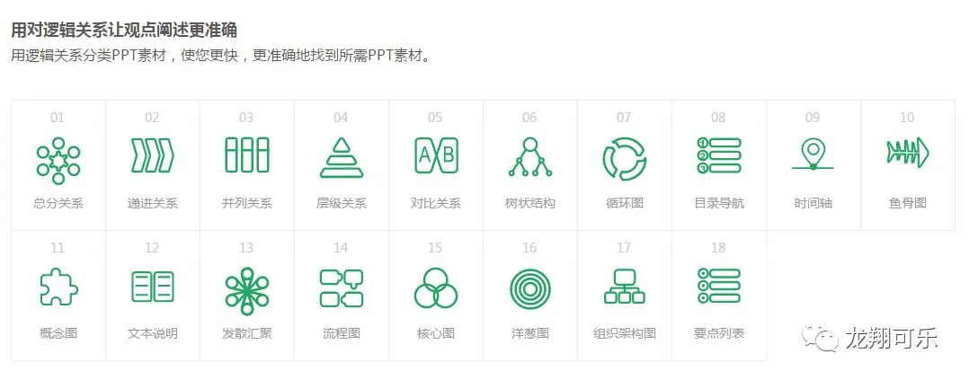 内容的形式化比较复杂,从宏观层面上讲,需要有一个完整的逻辑线贯穿整个PPT。从制作细节上讲,需要对文字进行信息提炼,对表进行优化,对图进行美化。在确定主题后,根据主题来设计逻辑线,让内容遵循一定的设计原则围绕逻辑线来呈现。这里,选取PPTmall中的一些素材分类给大家举例,看一下内容能够如何去组织。