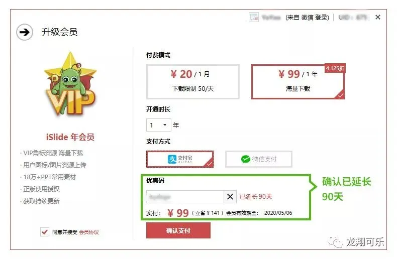 iSlide的年费是99元,使用微信注册付款就可以。如果你是PPTfans的会员,还可以用优惠码延长三个月的使用期。
