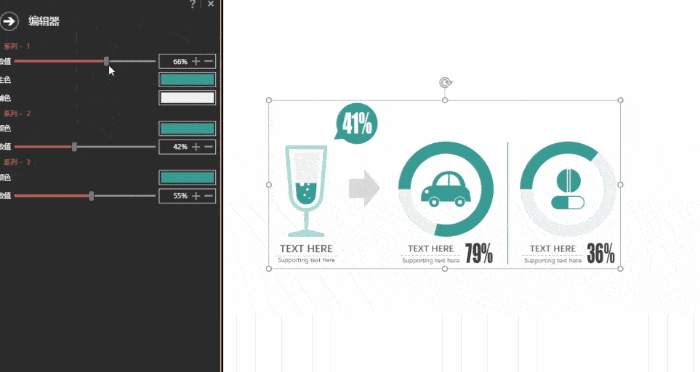 然后是iSlide的强项,各种可控图表。数据可视化一直是PPT里面非常重要的一个环节。绝大多数的PPT模板并不能提供灵活调整的图表显示。但iSlide插件能够根据数据的实际情况,对图表的填充、比例、尺寸等作出相应的变化。这是一个非常有用的功能。