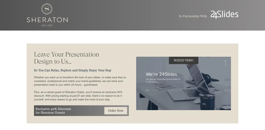 喜来登酒店联手了国外的一家设计公司“24 Slides”为住店客人提供PPT制作优化服务,并且此项服务承诺24小时内完成。
