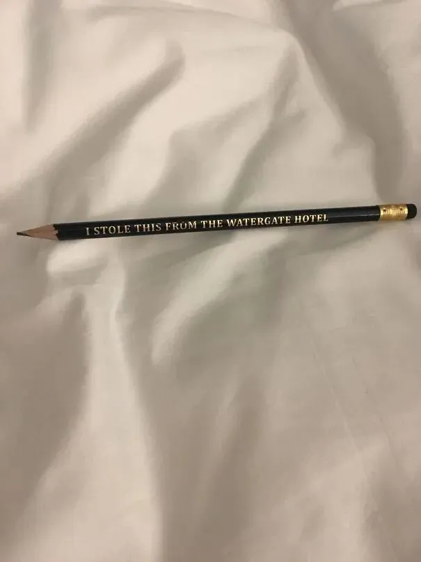 “酒店的笔上写着:我从水门酒店偷了这支笔。真是个好广告呀~”