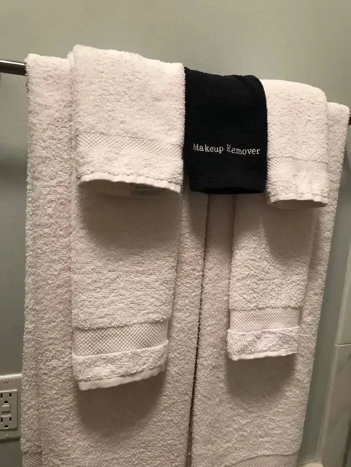 “酒店提供黑色毛巾用于卸妆和化妆。”