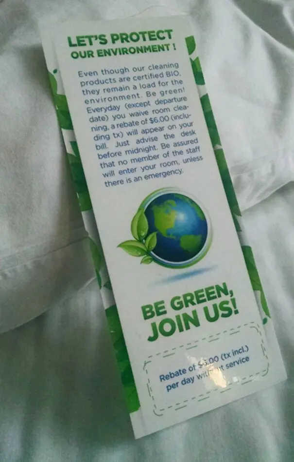 这家酒店每天为住客退还$6.00,以便减少房间打扫的次数,希望从小事上实现节能环保,避免浪费资源。”