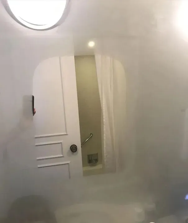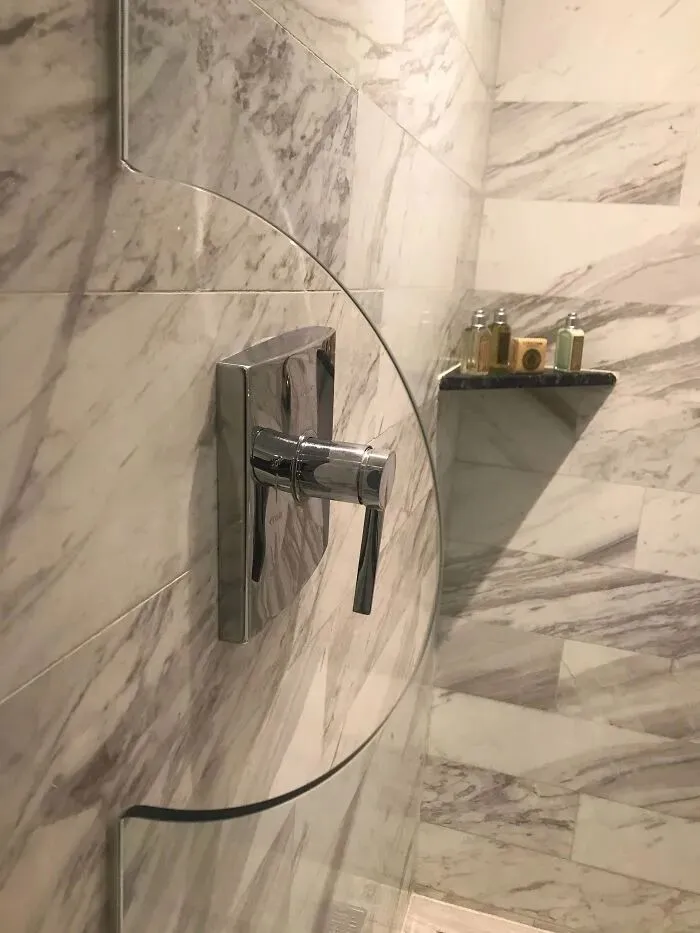 “酒店的淋浴间玻璃上有一个小缺口,可以在不进入淋浴间的情况下打开或关闭花洒。”