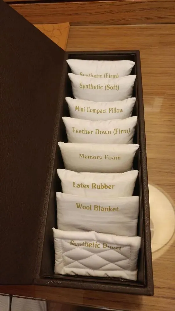 “酒店制作了一个小样枕盒,里面把8种枕头的特点写得清清楚楚,让人一下子就能找到自己适合的枕头类型。”