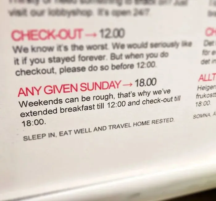 “周末我们将提供早餐至12:00,退房时间延至18:00。”