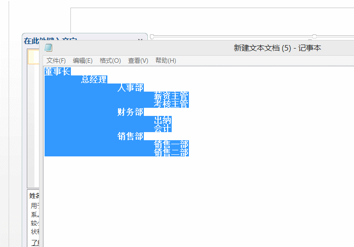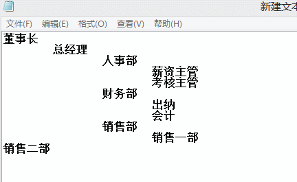 1、首先我们需要建一个text文档,输入各个部门的组织名称,注意部门退格要使用TAB键