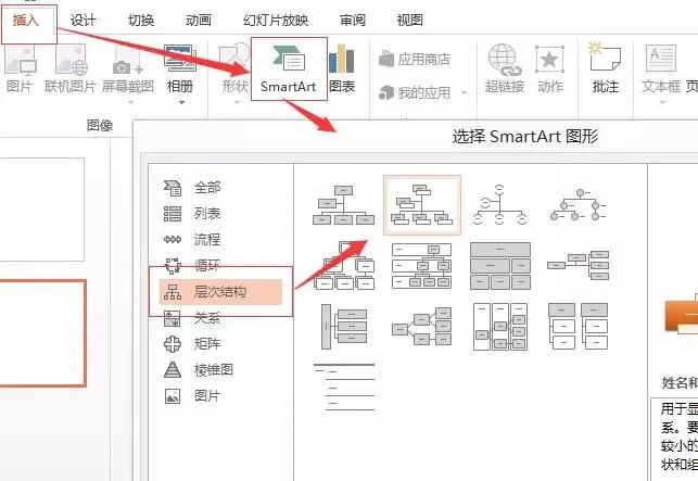 2、在PPT中,插入 - smartart - 层次结构 - 双击其中一个类别的模板