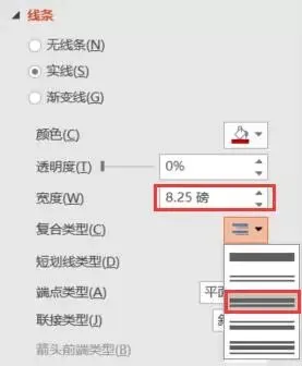 选择形状,右键选择【设置形状格式】,设置线框的宽度,选择【由细到粗】的复合型线条类型。