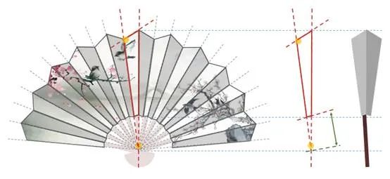 黄色圆圈标记的角度决定了后续形成的折扇形状,绿色线条标记的部分影响了扇柄的长度,所以这一步很关键。