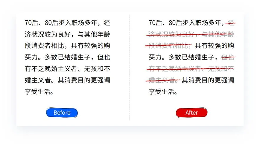意思重复的文字可以只保留一个,如下图中的「但也有不乏晚婚主义者…」与前面的文字意思是相同的,就可以被精简。