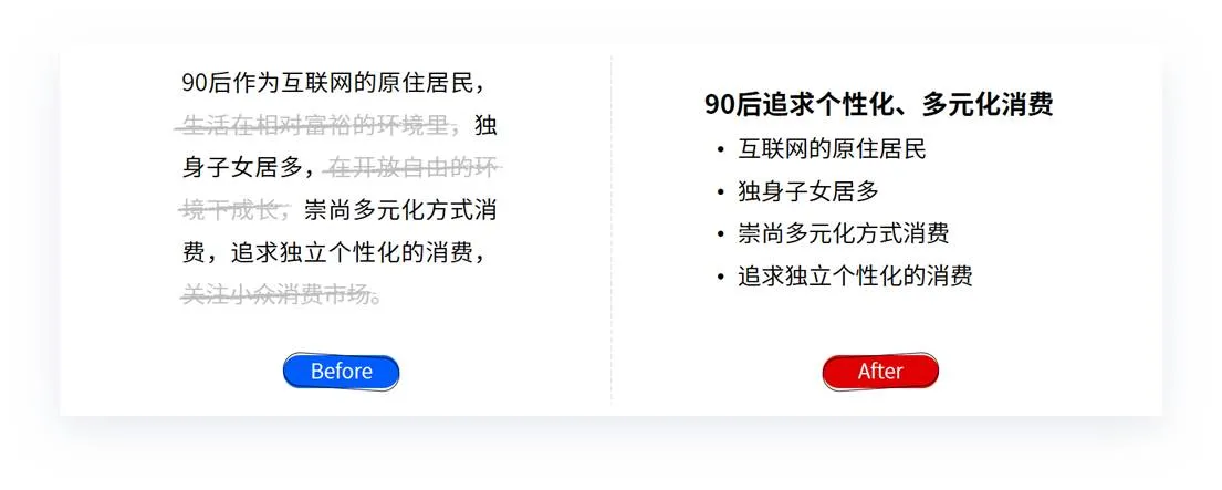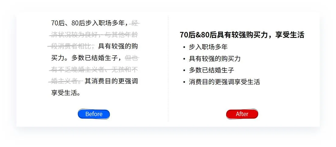 精简后的文字,就很方便转为列表,只需要按回车换行。这时候,你还可以为每段文字提炼一个总结性的小标题。