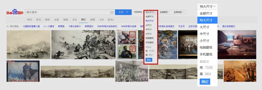 这时候其实只需要在搜索框的右侧,点击全部尺寸,选择特大尺寸,立刻就能感受到图片清晰度的提升