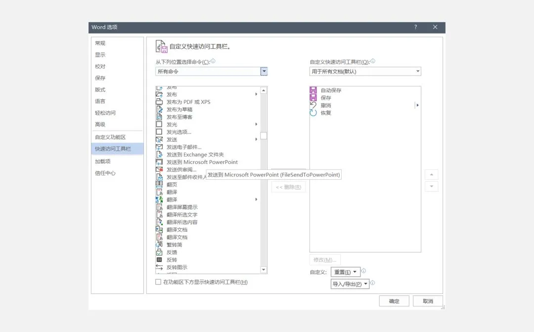 需要提醒大家的是,如果找不到发送到Powerpoint这个按钮,可以在文件-选项中点击自定义快速访问工具栏,手动将其添加。