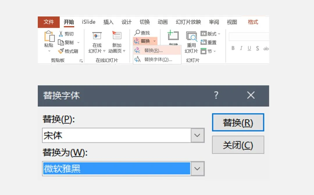 如果你是PPT小白,可以直接在开始选项卡找到替换按钮,选择替换字体即可。缺点是如果原来使用了太多的字体,调整起来非常麻烦。