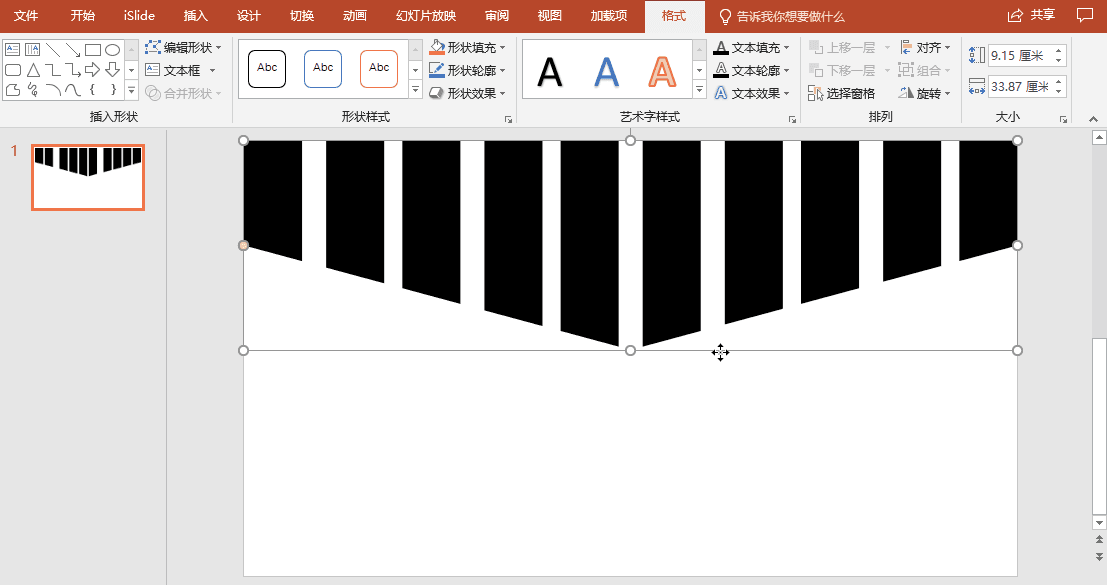 ❷【格式】-【文本效果】-【转换】,选择【三角:倒】;