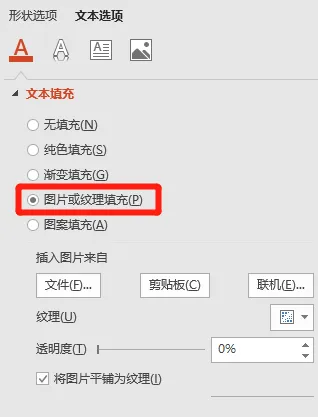 ❷【文本选项】-【文本填充】-【图片或纹理填充】;