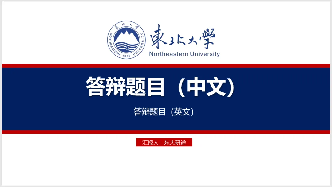 封面应包含论文题目、答辩人与导师信息、答辩日期等。为了不遮挡前述重要信息,封面背景一般设置为浅色(白色最好),在封面上加上学校logo即可,也可以加上学校的标志性建筑物或其他代表学校的图案(可以从研小途往期推文中找美图哦)。