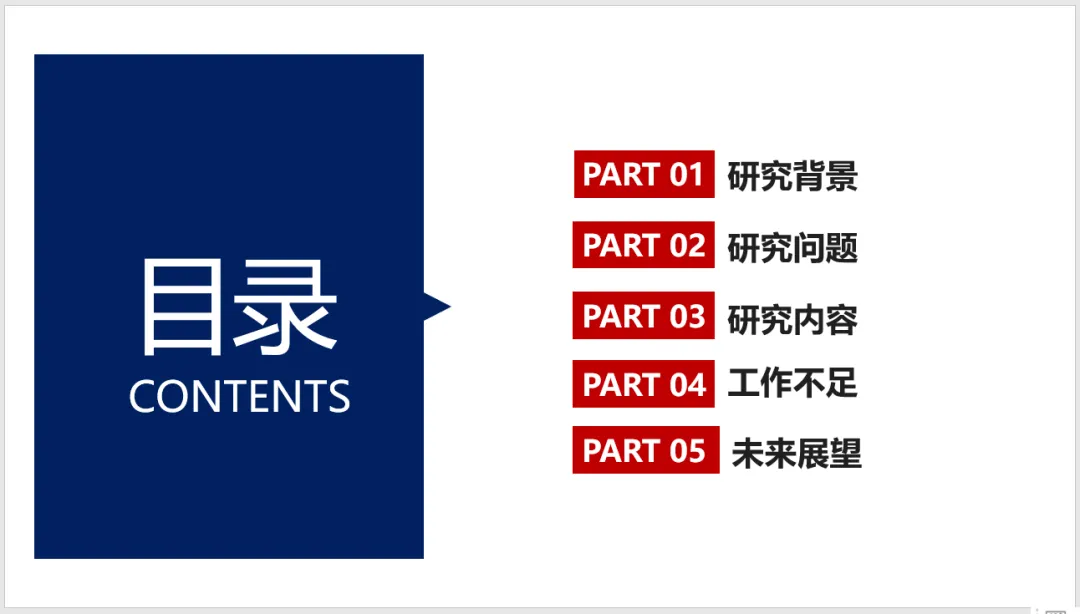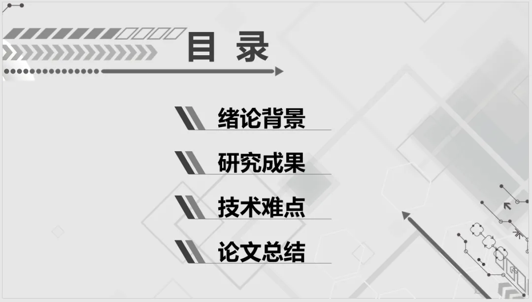 目录应遵循逻辑清晰,简洁明了,专家们通过这一页便可以了解你汇报的层次。目录一般包括研究背景、研究内容(论文中的几项工作)、总结与展望等等,也可以根据自己的研究逻辑进行适当的调整。