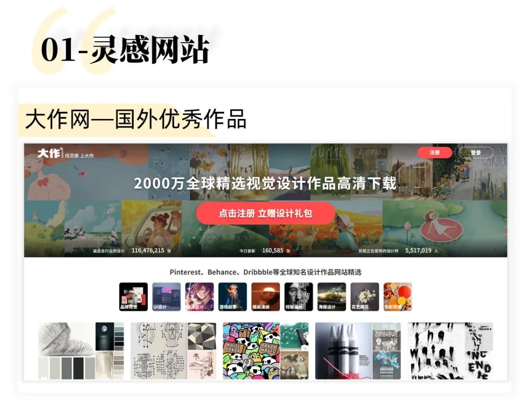 如何建立自己的专属灵感库,可能是每一位PPT设计师都需要学习一项能力,但并非每个人都能够很好地进行文件管理。所以,本周,我们在旁友圈PPT学习社群,发起了第4期旁友圆桌话题,主要就聊聊这个事儿,这篇文章,就分享其中一位嘉宾的内容。每个设计师都拥有自己的灵感库,经历了花瓣关闭,素材告急的痛苦之后,你是如何建立自己的本地灵感库的呢?很荣幸被旁友圈邀请,参与“旁友圆桌”分享,话题是『关于如何建立自己的专属灵感库』,无保留分享给你。大鱼塘才能钓大鱼,去垃圾场找金子,那是为难自己。所以,寻找灵感的第1步,是积累一些优秀的灵感来源地。提起灵感图片的搜寻,大家第1个想到的肯定是网站,比如说花瓣、站酷、优设灵感等优秀的设计网站。当然,还有Dribble、Behance等一众国外优秀网站,但是如果我们无法翻出去的话,还是看不到。这里推荐一个国内网站--大作,它将一些国外优秀作品搬运过来,不用翻,就可以直接看到国外优秀设计啦。设计公司官网是优秀设计灵感,尤其是优秀定制项目的重要来源。在这里推荐大家阅读邵大的一篇文章,在文章当中,作者推荐了很多顶级设计类公司,都提供了一些高端定制案例,值得学习参考。这一类活动有很多,比如旁友圈的每周作业和甲方来袭。这些活动,会激发优秀设计师的设计欲望,从而产生一大批优秀的设计作品,关注他们,不但可以得到优秀的灵感参考,还可以“追踪”每个优秀设计师的设计思维方法。 Eagle有非常强大的收集和整理能力,而且不用害怕文件的丢失。我们以往是在花瓣或其他网站上收集素材,当网站崩溃或者关闭时,小伙伴们一定体会过没有灵感参考的痛苦了。Eagle是一个本地化软件,它将所有文件收集,自动存放到本地文件当中,妈妈再也不用担心你,断网的时候找不到灵感了啦。当然,Eagle 也有一个缺点,就是收费:199/终身。虽然价格不高,但是如果有小伙伴介意,也可以使用一些免费的网页插件,比如图片助手 ImageAssistant。下载插件并安装之后,点击插件,会自动解析出当前网页的所有图片,然后挑选心爱的图片,就可以存到自己的文件夹了。花瓣提供了大量的素材和灵感图片,相信有很多人遇到设计任务时,第1个反应就是打开花瓣,寻找优秀设计来借鉴,当有素材需要的时候,也是打开花瓣搜索相关资源,为设计提供了极大的便利。在花瓣中看到喜欢的灵感图片,可随手采集到自己的画板中,也可以关注一些优秀的画板,这样,以后寻找起来会非常方便。比如最近设计的一套证书模板,就是在邵大的画板中找到的设计灵感。