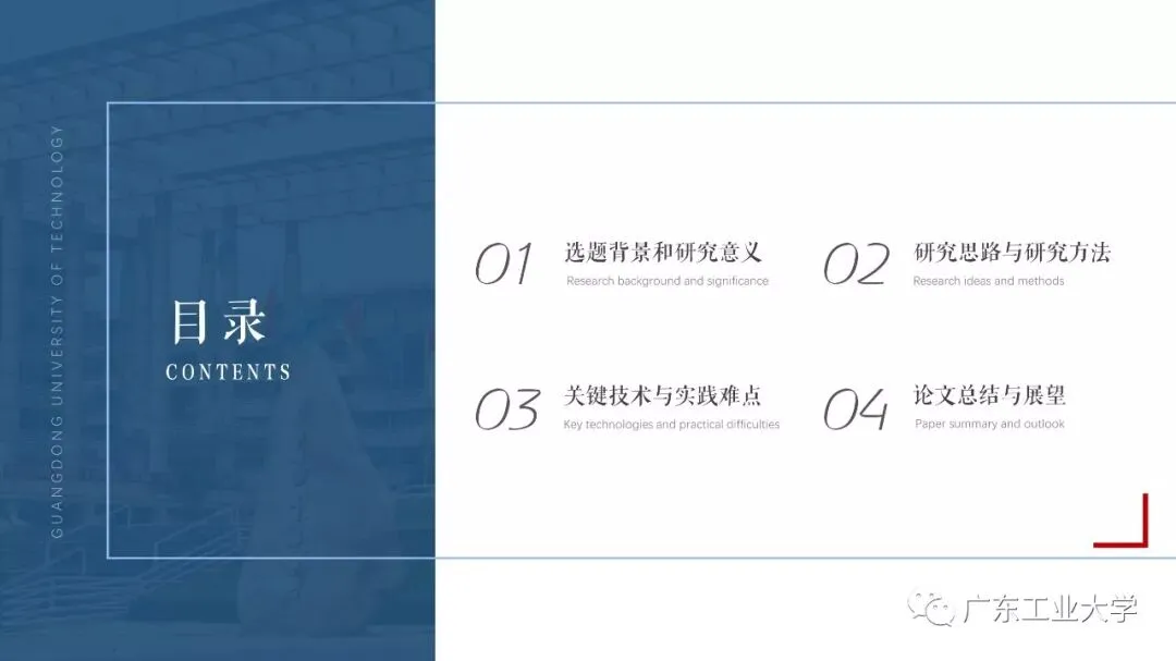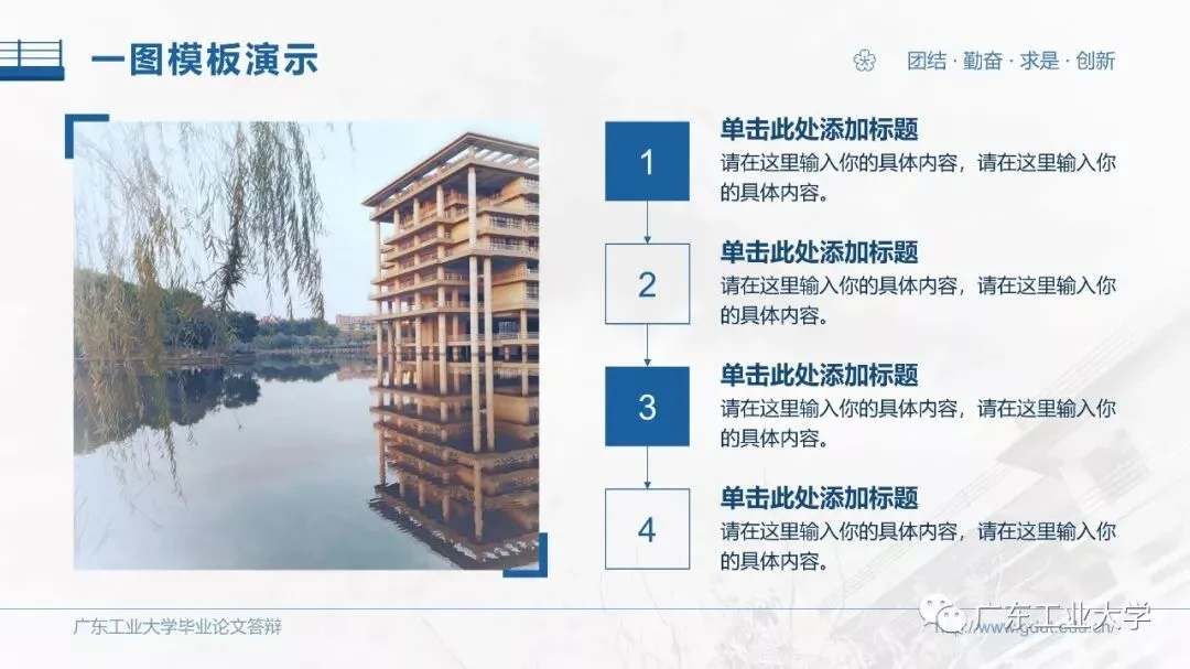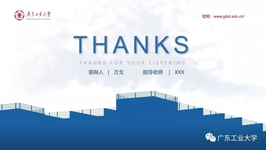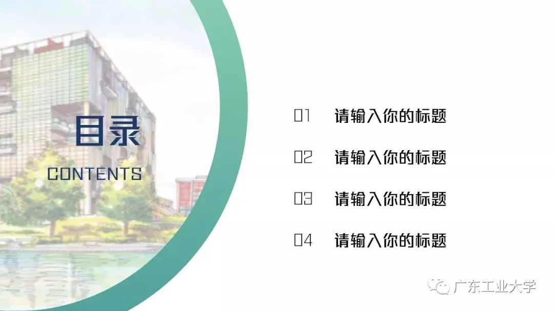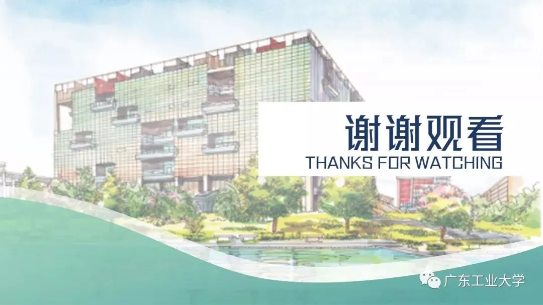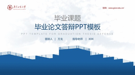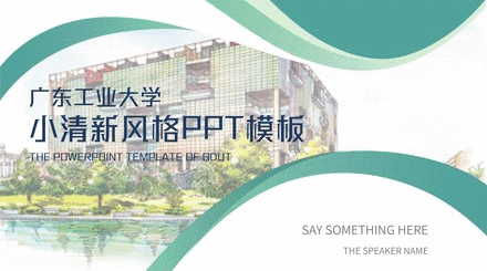 答辩模板的风格较为严肃,考虑到我们在平时做PPT时都不喜欢太刻板的东西,所以我又设计了一套较为青春风的小清新模板。模板选用青和蓝作为主色调,选用了广工景色的水彩画作为背景,使得整体风格显得青春活力。